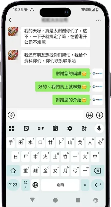 我哋公司中途要加新董事,自己唔識搞。係網上睇到有人推薦OneSEC,於是就試下搵佢哋幫手。佢哋熟晒公司註冊處嘅手續,所有表格、文件都好快處理好,過程真嘅超快超順~